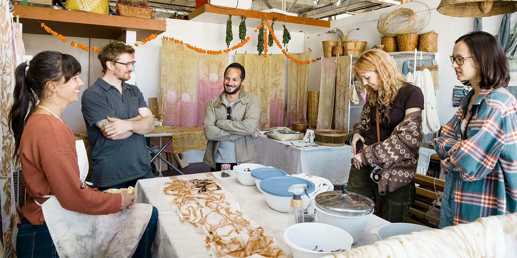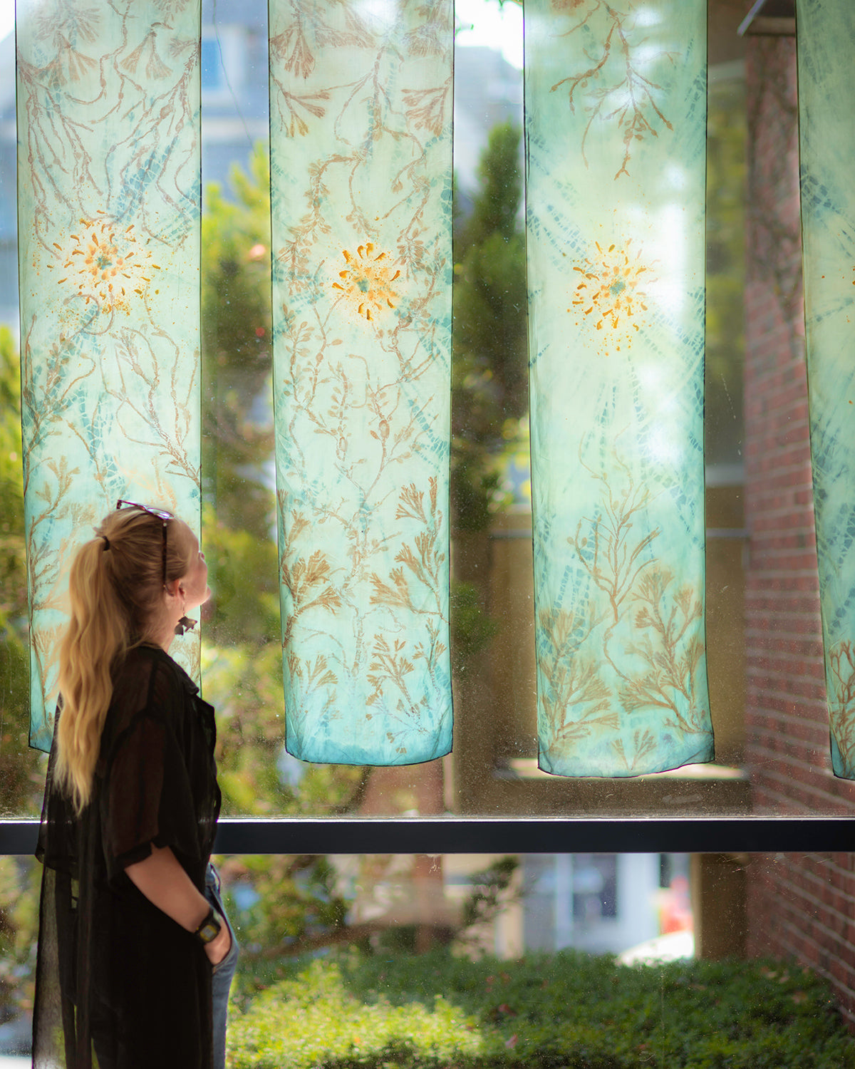 This multi day class takes us into the surrounding landscapes of Penobscot Bay, Maine, for foraging time and brings us back to the studio to learn about mordanting methods for natural dye applications on fiber. We will eco-printing various species of our foraged seaweeds, and other plants and minerals an intrepid printer may want to explore. Then we will spend time experimenting with tie resist and block resist methods, with dye baths from our collected and processed plants. We will learn how to make our own inks to further add depth and style to our pieces, creating layered and narrative-rich panels that can be transformed into apparel or a decoration for the home.
