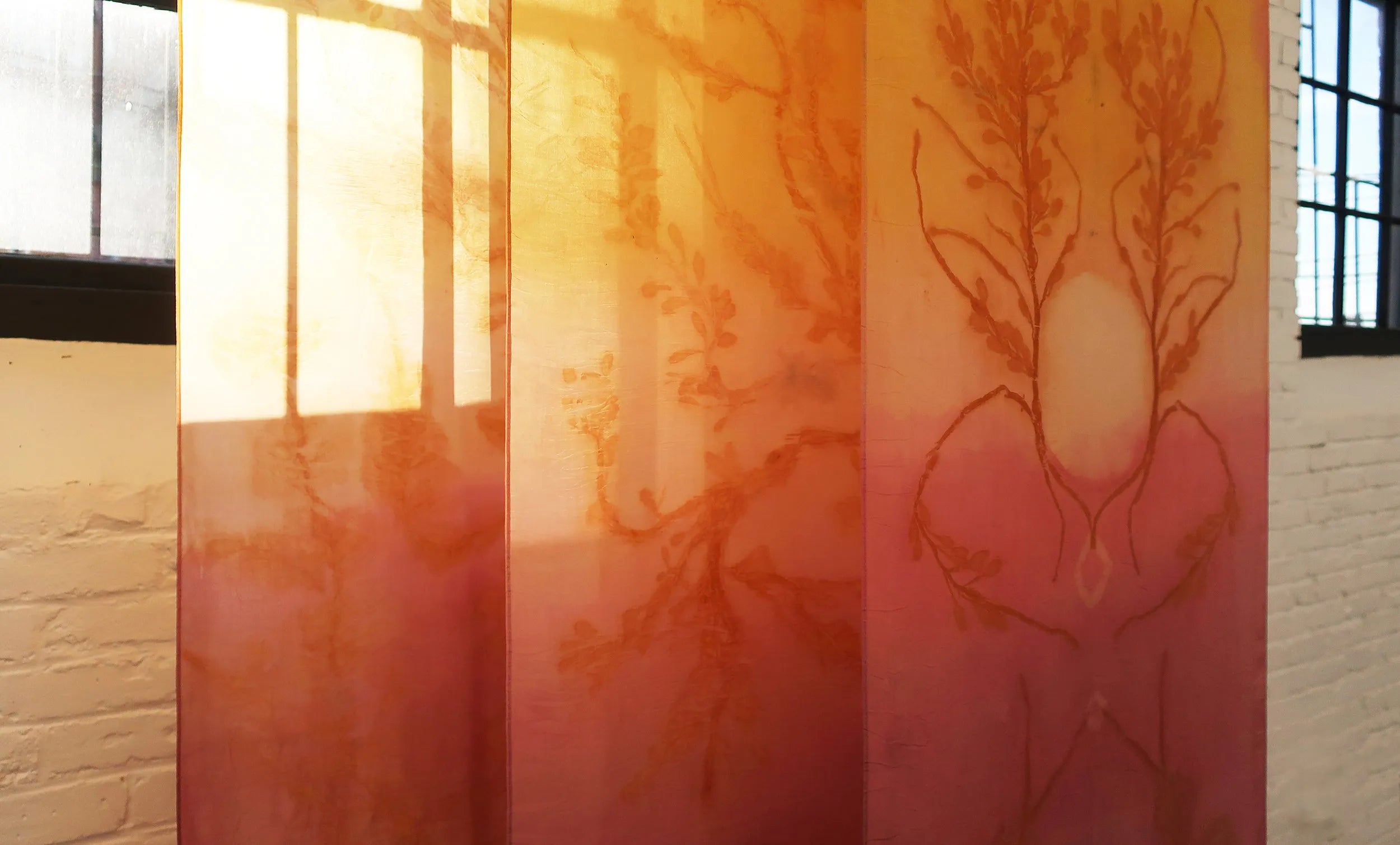 It is a naturally dyed, eco- printed textile installation. The transition between the darker and lighter tones serves as a reference to the tidal range of the coastlines where the seaweed is foraged. Nested inside the installation, but not scene from any vantage point, is a spherical light source, (a round paper lantern), glowing softly, appearing like a sun balanced within the horizon between the ocean and sky. The silk panels are sensitive to the slightest movement of air, they dance peacefully like a kelp forest.