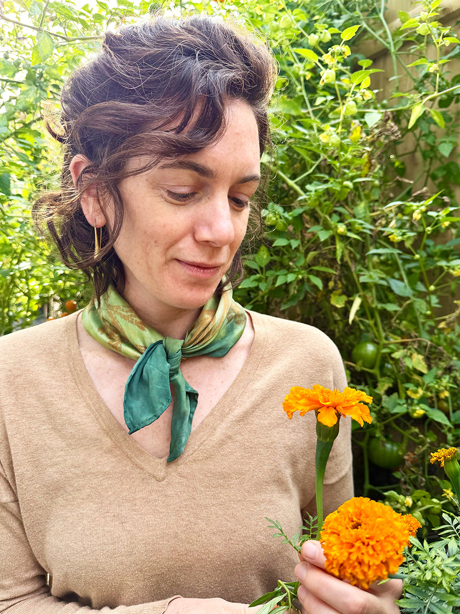 This large bandana effortlessly adds a touch of sophistication and radiant energy to any ensemble. Printed with seaweed, and dyed with oak, marigold, and indigo, it is versatile in style, serving as an elegant neckerchief, a chic headband, or a charming accessory. This is our most seasonal color and quantities are very limited of these beauties.