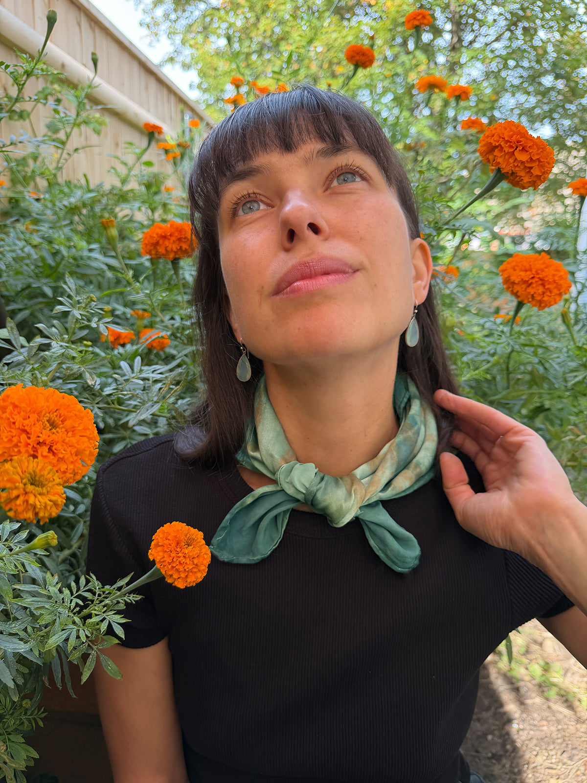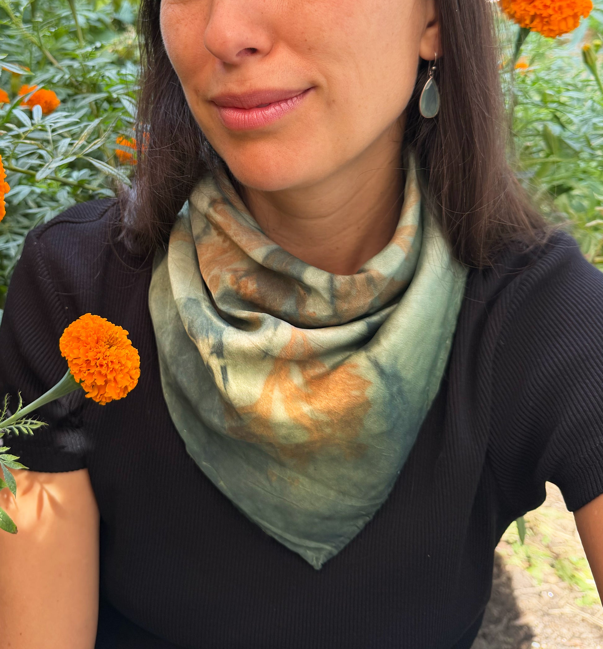 This large bandana effortlessly adds a touch of sophistication and radiant energy to any ensemble. Printed with seaweed, and dyed with oak and indigo, it is versatile in style, serving as an elegant neckerchief, a chic headband, or a charming accessory. This is our most seasonal color and quantities are very limited of these beauties.